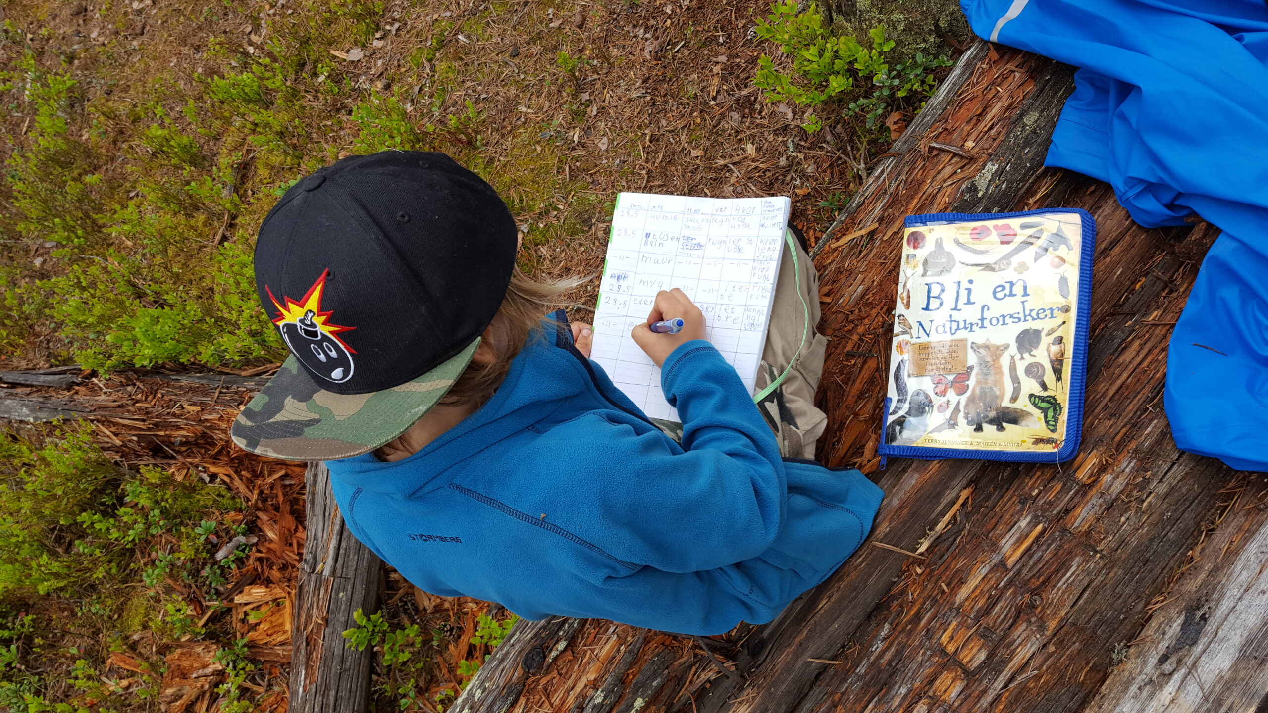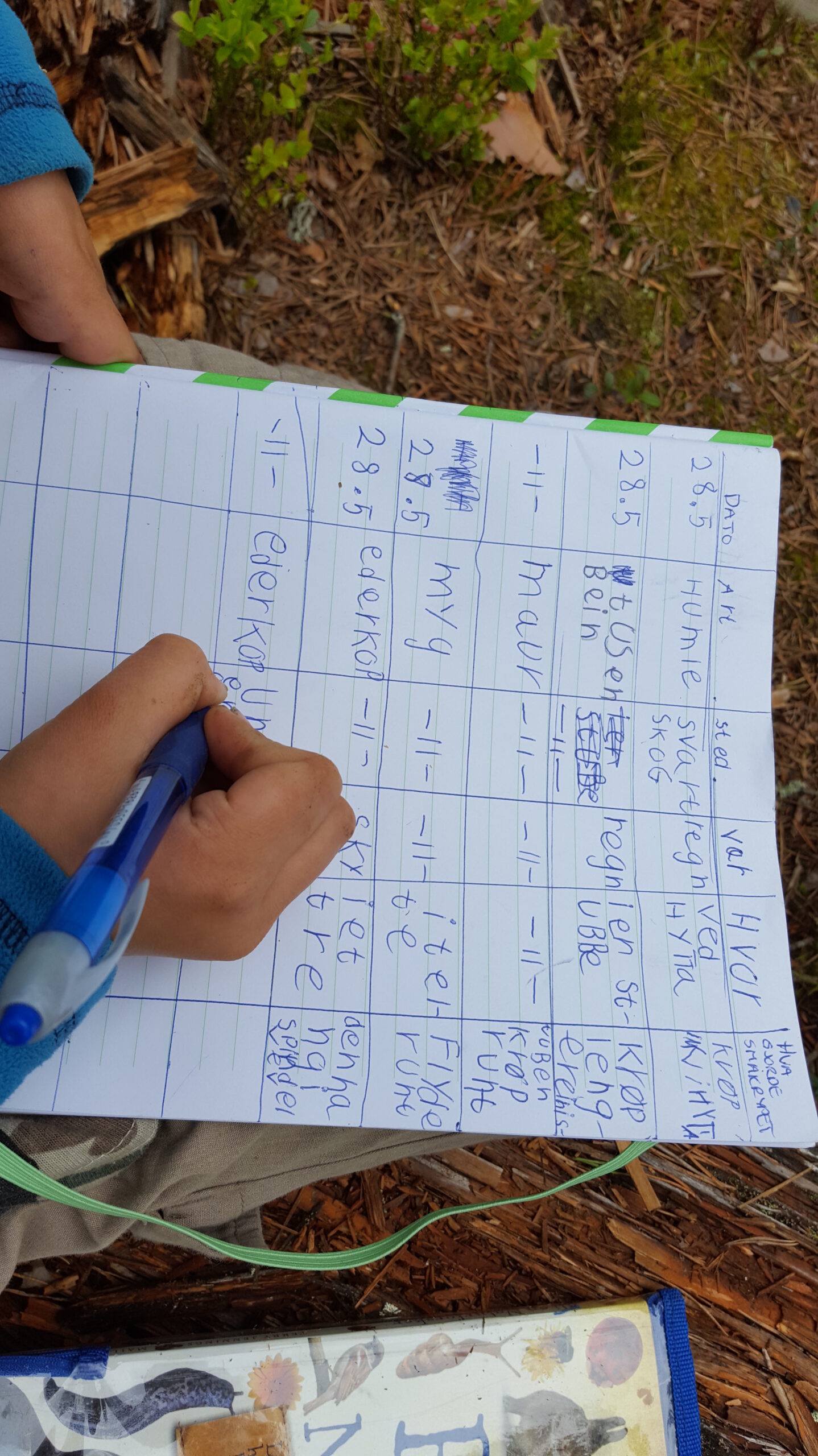 Noe av det beste 3-åringen vet er å fange småkryp. De ble det mange av på denne turen. Guttene har en naturforsker bok som vi har begynt å ta med oss på tur, der leser vi om krypene og dyrene vi ser og man får en introduksjon på hvordan man kan bli en naturforsker. Dette synes eldstegutten er veldig spennende. Vi hadde med en notatbok der han lagde en oversikt over småkrypene de fant: Dato, art, sted, vær, hvor og hva småkrypet gjorde når han fant det. Jeg spurte han hva han ønsket å finne ut av opplysningene han fikk. Han ønsker å finne ut hvilke kryp han finner flest av, om lik art gjør det samme og om de befinner seg på samme sted. Han ønsker å skrive mange sider før han trekker en konklusjon.Vi fant et tre som hakkespetten hadde vært på. Det var ekstra spennende nå som hullene var så langt nede at de fikk utforsket de skikkelig.