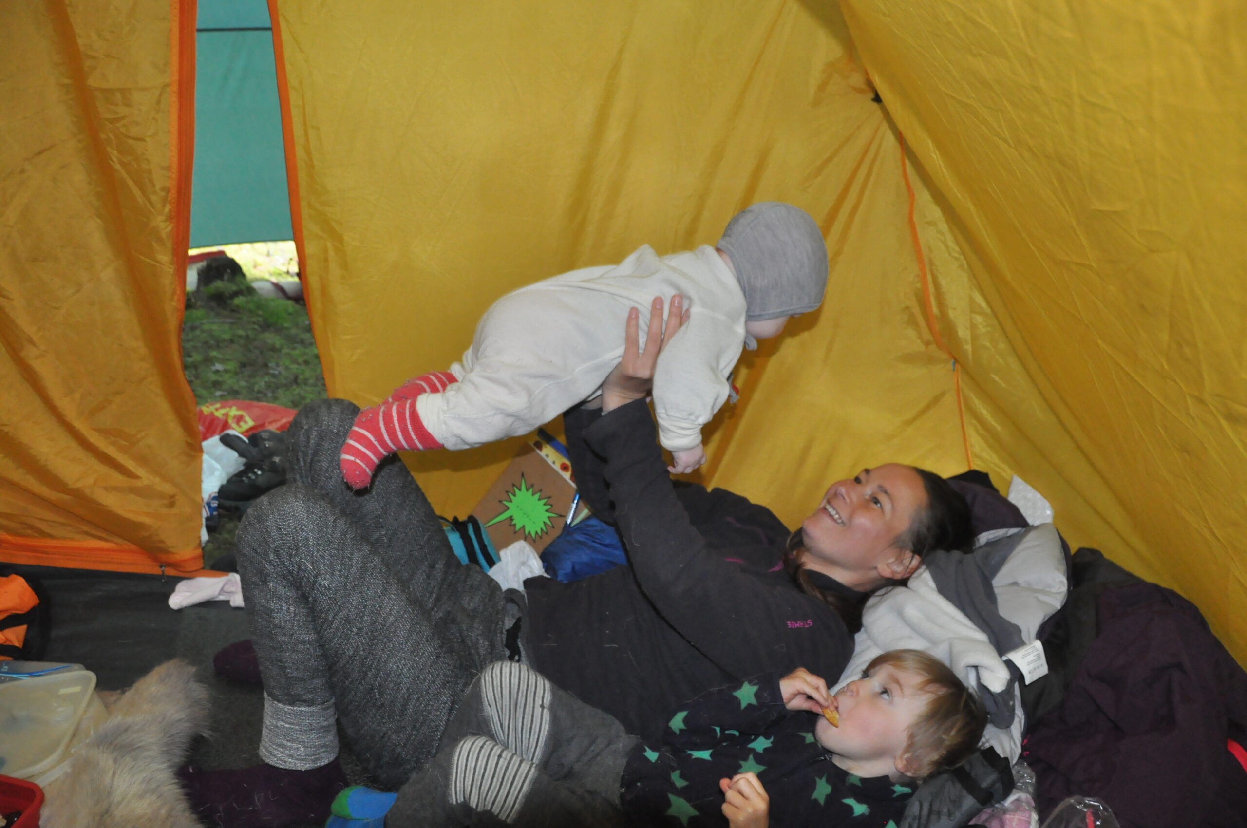 Herjing og basing i teltet er noe av det morsomste denne fyren vet, og siden det regnet ble det mye av det denne morgenen.